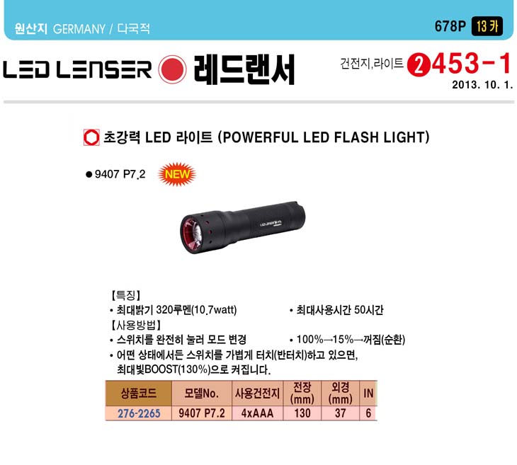 [·¹µå·£¼­] Ãʰ­·Â LED ¶óÀÌÆ®(9407 P7.2, AAAx4°³, 130x37mm, 320·ç¸à/10.7Watt)(Powerful LED Flashlight)