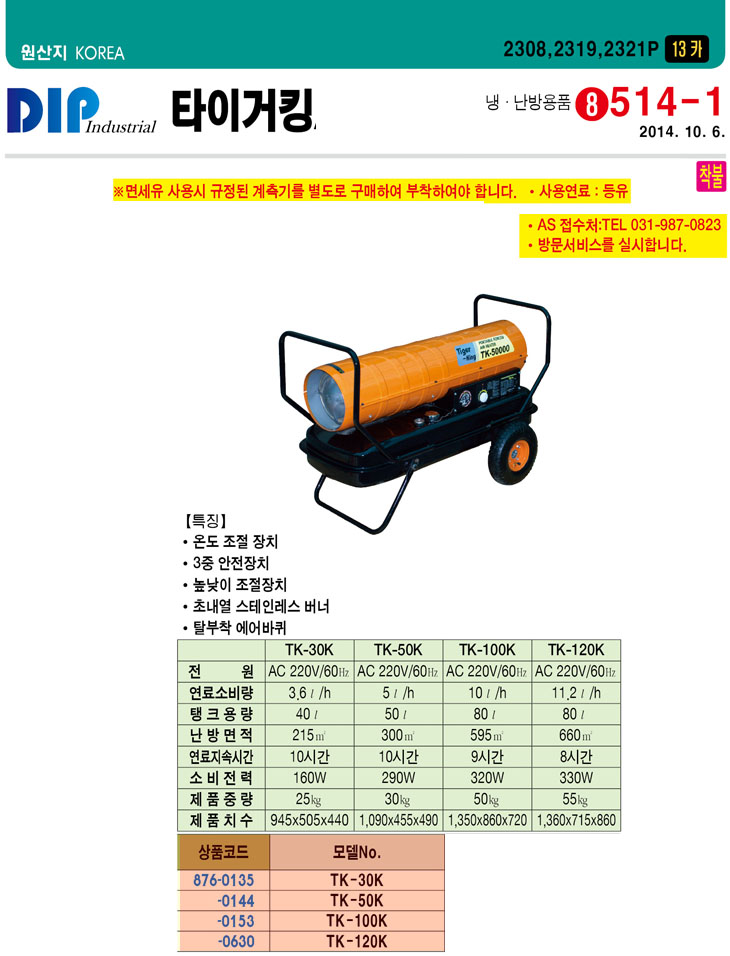 [ŸÀ̰ÅÅ·]¿­Ç³±â(TK-120K, 1360x715x860mm)(PORTABLE HEATER)(ÁÖ¹®Àü Àç°íÈ®ÀÎ)