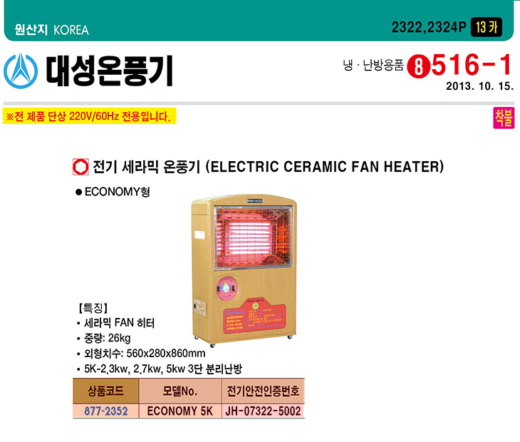 [´ë¼º¿Âdz±â] Àü±â¼¼¶ó¹Í ¿Âdz±â(ECONOMY 5K,5000Watt, 560x280x860mm)(Electric Ceramic Fan Heater)