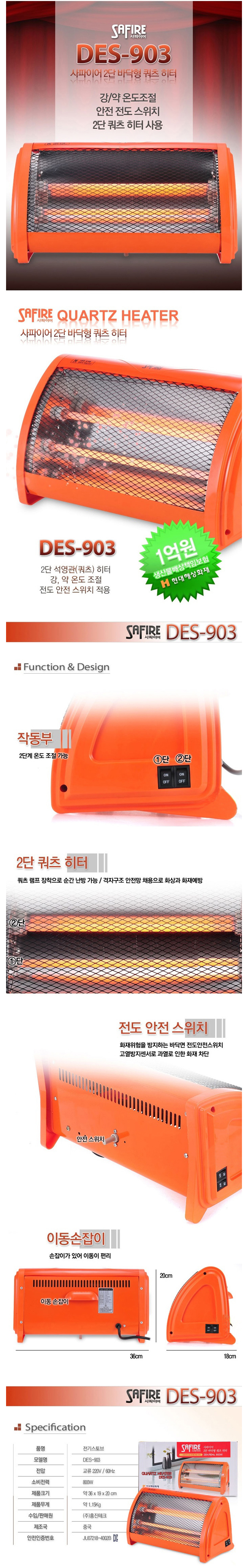 [È«Áø»çÆÄÀ̾î] ÄõÃ÷È÷ÅÍ(DES-903, 370x185x210mm, 500~1000Watt)(Quartz Heater)