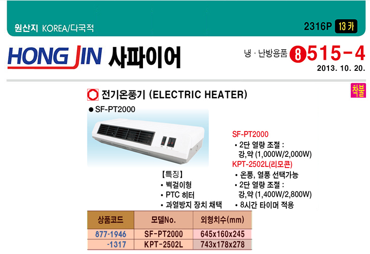 [È«Áø»çÆÄÀ̾î] Àü±â¿Âdz±â(SF-PT2000, 645x160x245mm)(Electric Heater)