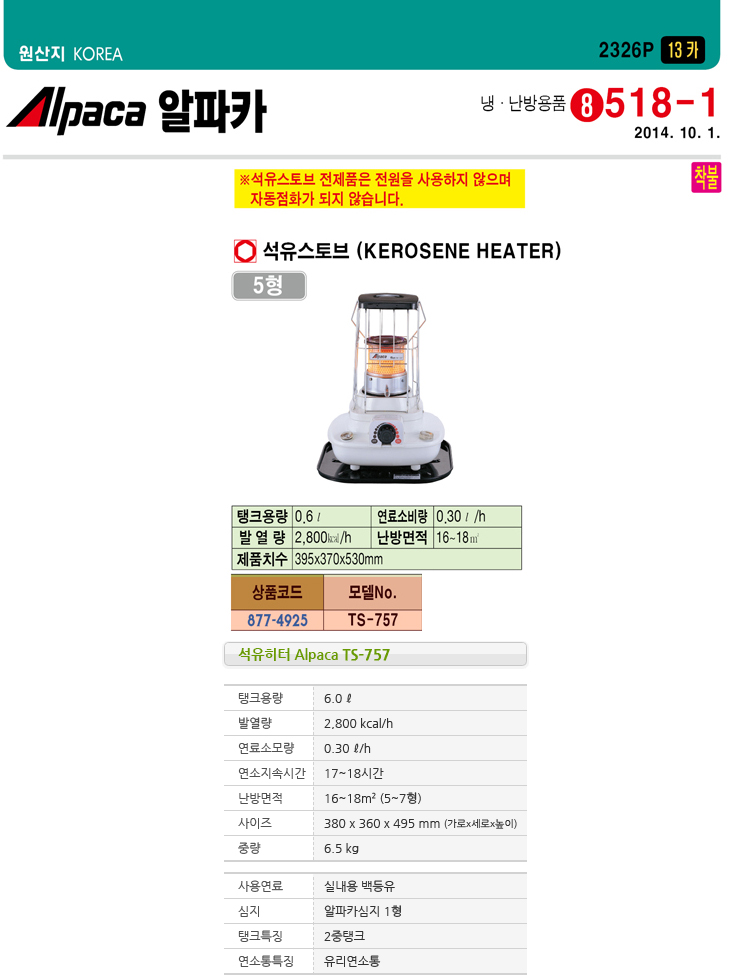 [¾ËÆÄÄ«] ¼®À¯½ºÅäºê(TS-757, 395x370x530mm, 6.0¸®ÅÍ)(Kerosene Heater)