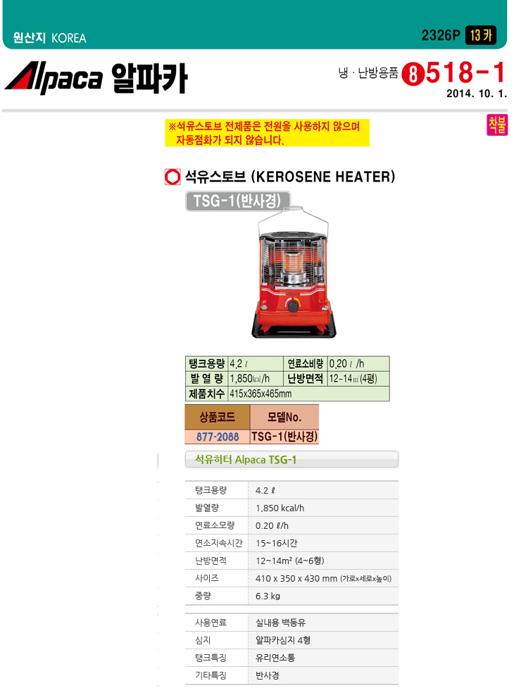 [¾ËÆÄÄ«] ¼®À¯½ºÅäºê(TSG-1, 415x365x465mm, 4.2¸®ÅÍ)(Kerosene Heater)