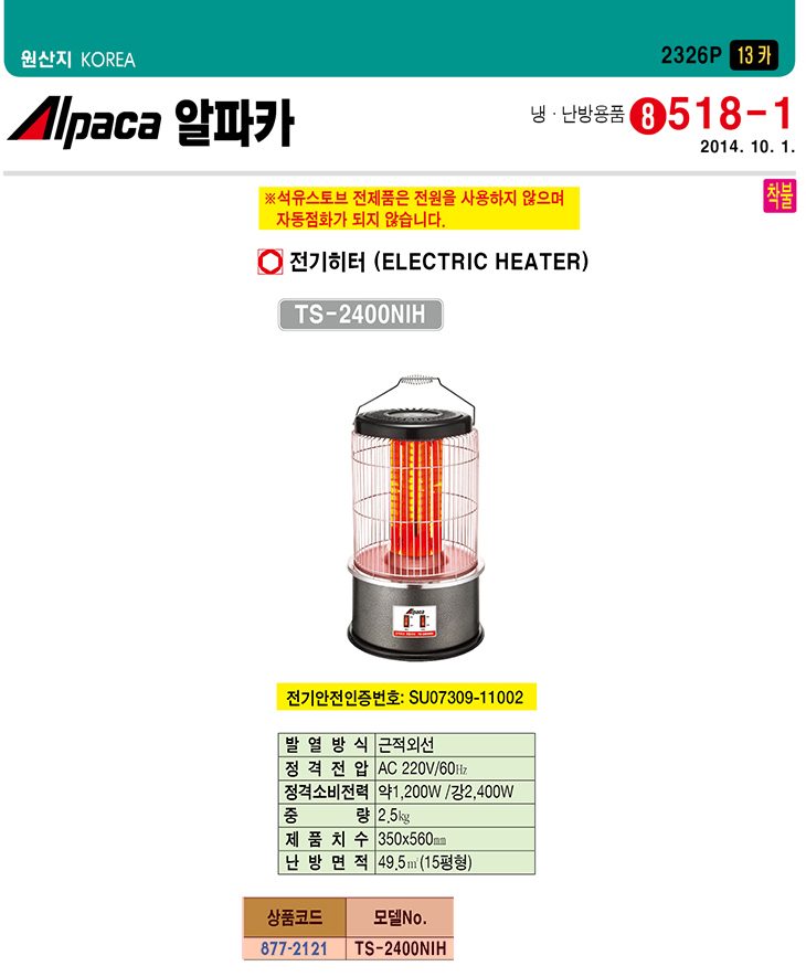 [¾ËÆÄÄ«] Àü±âÈ÷ÅÍ(TS-2400NIH, 350x560mm,1200~2400Watt)(Electric Heater)