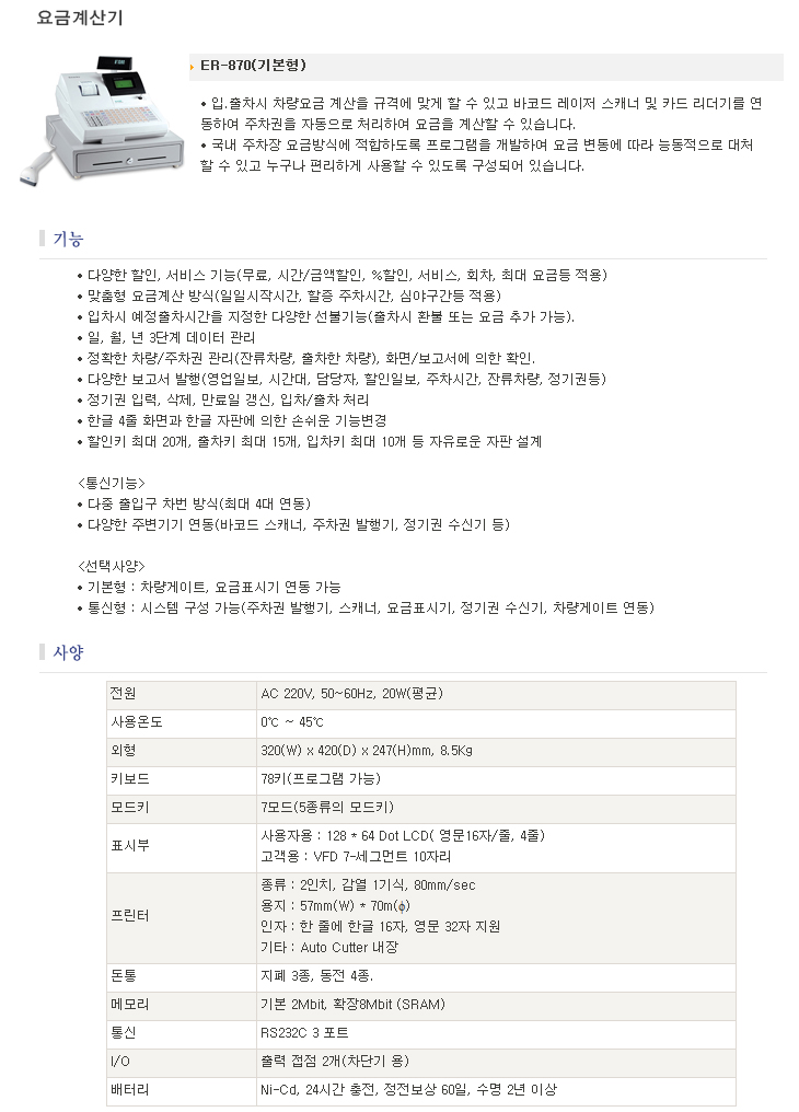[WT] POSÇü ÁÖÂ÷¿ä±Ý°è»ê±â(ER-870 ±âº»Çü:ÁÖÂ÷Â÷´Ü±â ¿¬µ¿ ºÒ°¡)(POS Type Fee Calculation Terminal)
