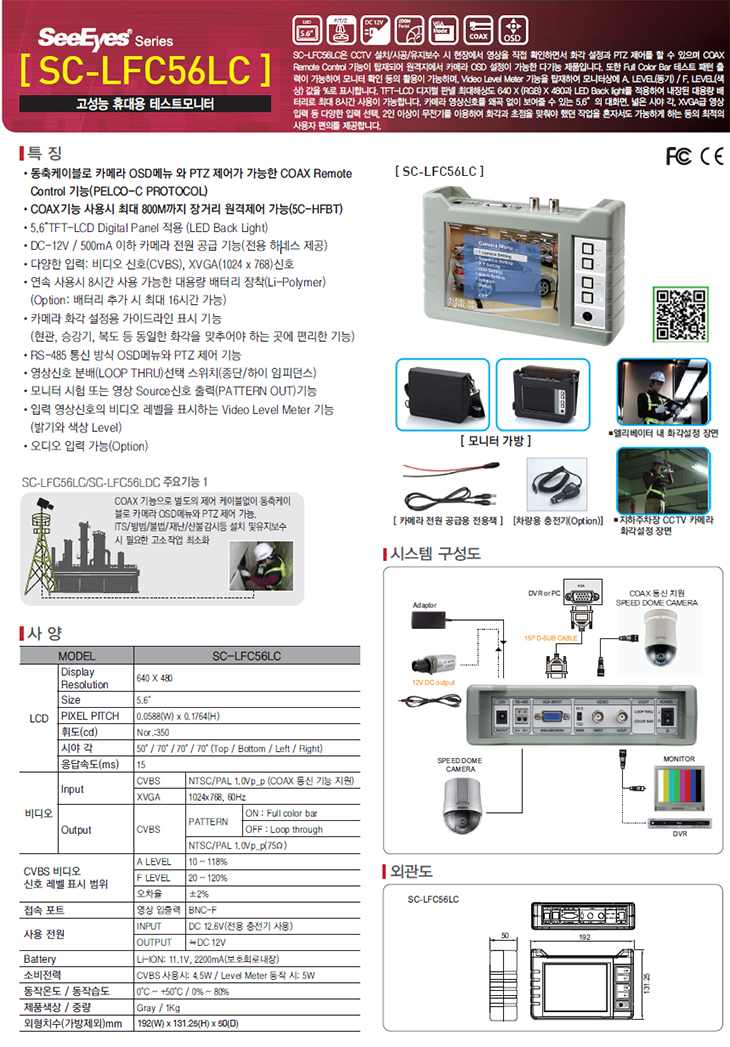 SC-LFC56LÀº CCTV ¼³Ä¡/½Ã°ø/À¯Áöº¸¼ö ½Ã ÇöÀå¿¡¼ ¿µ»óÀ» Á÷Á¢ È®ÀÎÇÏ¸é¼ È°¢ ¼³Á¤°ú PTZ Á¦¾î¸¦ ÇÒ ¼ö ÀÖÀ¸¸ç COAX Remote Control ±â´ÉÀÌ Å¾ÀçµÇ¾î ¿ø°ÝÁö¿¡¼ Ä«¸Þ¶ó OSD ¼³Á¤ÀÌ °¡´ÉÇÑ ´Ù±â´É Á¦Ç°ÀÔ´Ï´Ù. ¶ÇÇÑ Full Color Bar Å×½ºÆ® ÆÐÅÏ Ãâ·ÂÀÌ °¡´ÉÇÏ¿© ¸ð´ÏÅÍ È®ÀÎ µîÀÇ È°¿ëÀÌ °¡´ÉÇϸç, Video Level Meter ±â´ÉÀ» žÀçÇÏ¿© ¸ð´ÏÅÍ»ó¿¡ A. LEVEL(µ¿±â)/F. LEVEL(»ö»ó) °ªÀ» %·Î Ç¥½ÃÇÕ´Ï´Ù. TFT-LCD µðÁöÅÐ ÆÇ³Ú ÃÖ´ëÇØ»óµµ 640 X (RGB) X 480°ú LED Back light¸¦ Àû¿ëÇÏ¿© ³»ÀåµÈ ´ë¿ë·® ¹èÅ͸®·Î ÃÖ´ë 8½Ã°£ »ç¿ë °¡´ÉÇÕ´Ï´Ù. Ä«¸Þ¶ó ¿µ»ó½ÅÈ£¸¦ ¿Ö°î ¾øÀÌ º¸¿©ÁÙ ¼ö ÀÖ´Â 5.6“ÀÇ ³ÐÀº ½Ã¾ß °¢, XVGA±Þ ¿µ»óÀÔ·Â µî ´Ù¾çÇÑ ÀÔ·Â ¼±ÅÃ, 2ÀÎ ÀÌ»óÀÌ ¹«Àü±â¸¦ ÀÌ¿ëÇÏ¿© Ȱ¢°ú ÃÊÁ¡À» ¸ÂÃç¾ß Çß´ø ÀÛ¾÷À» È¥ÀÚ¼µµ °¡´ÉÇÏ°Ô ÇÏ´Â µîÀÇ ÃÖÀûÀÇ »ç¿ëÀÚ ÆíÀǸ¦ Á¦°øÇÕ´Ï´Ù. |