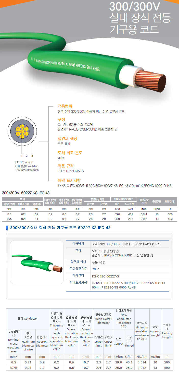 [KS]Àü¿øÄÉÀ̺í 300/300V ½Ç³» Àå½Ä Àüµî ±â±¸¿ë ÄÚµå 60227 KS IEC 43(DIW)