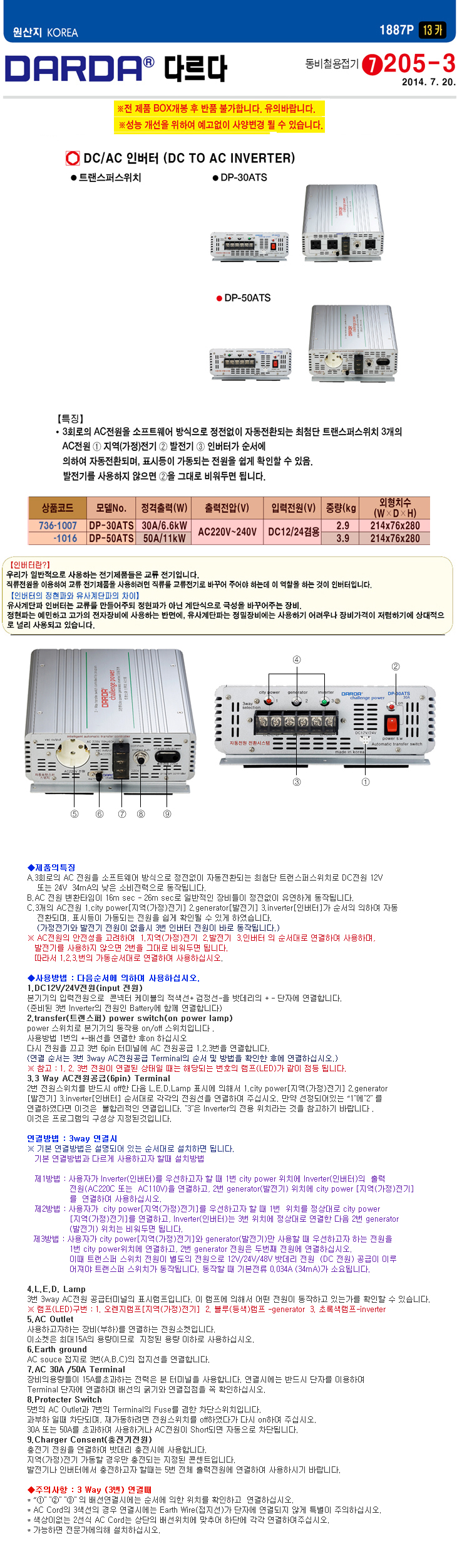 [DARDA] ´Ù¸£´Ù DC/ACÀιöÅÍ Æ®·£½ºÆÛ½ºÀ§Ä¡(DP-30ATS,ÀÔ·Â:12/24VDC,Ãâ·Â:220VAC~240V 6.6Kw)(DC to AC Inverter)(ÁÖ¹®ÀüÀç°íÈ®ÀÎ)