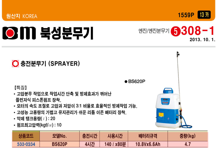 [ºÏ¼º] ÃæÀüºÐ¹«±â(B620P, ¾àÁ¦ÅÊÅ©¿ë·®:20¸®ÅÍ, ÃæÀü½Ã°£:4½Ã°£)(Sprayer)