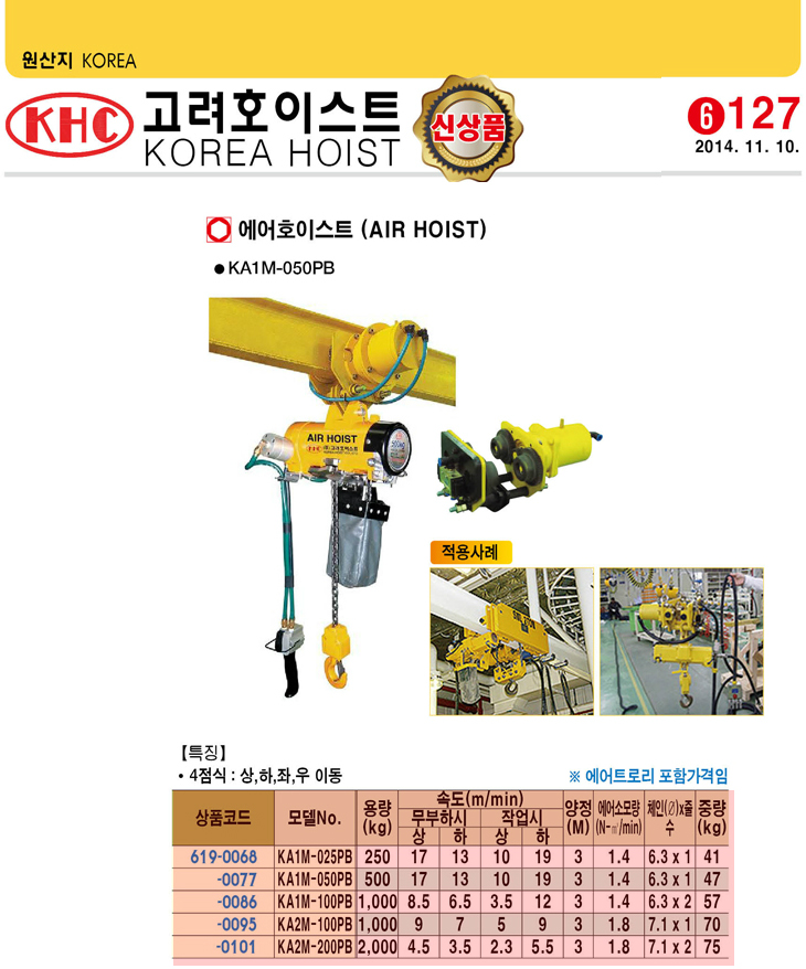 [°í·Á] Æ®·Ñ¸® ¿¡¾îÈ£À̽ºÆ®(KA1M-050PB, 500KG, 3¹ÌÅÍ ¾çÁ¤, È­ÇаøÀå/°¡½º°øÀå ¹æÆøÇü È£À̽ºÆ®)(Air Hoist)