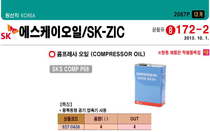 [SK] ÄÞÇÁ·¹»þ ¿ÀÀÏ(SKS COMP P68, 4¸®ÅÍ, ¿Õº¹µ¿Çü ¾ÐÃà±âÀ¯)(Compressor Oil)