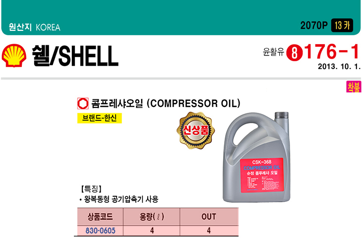 [ÇѽÅ] ÄÞÇÁ·¹»þ ¿ÀÀÏ(CSK-368, 4¸®ÅÍ, ¿Õº¹µ¿Çü °ø±â¾ÐÃà¿ë ¿ÀÀÏ)(Compressor Oil)