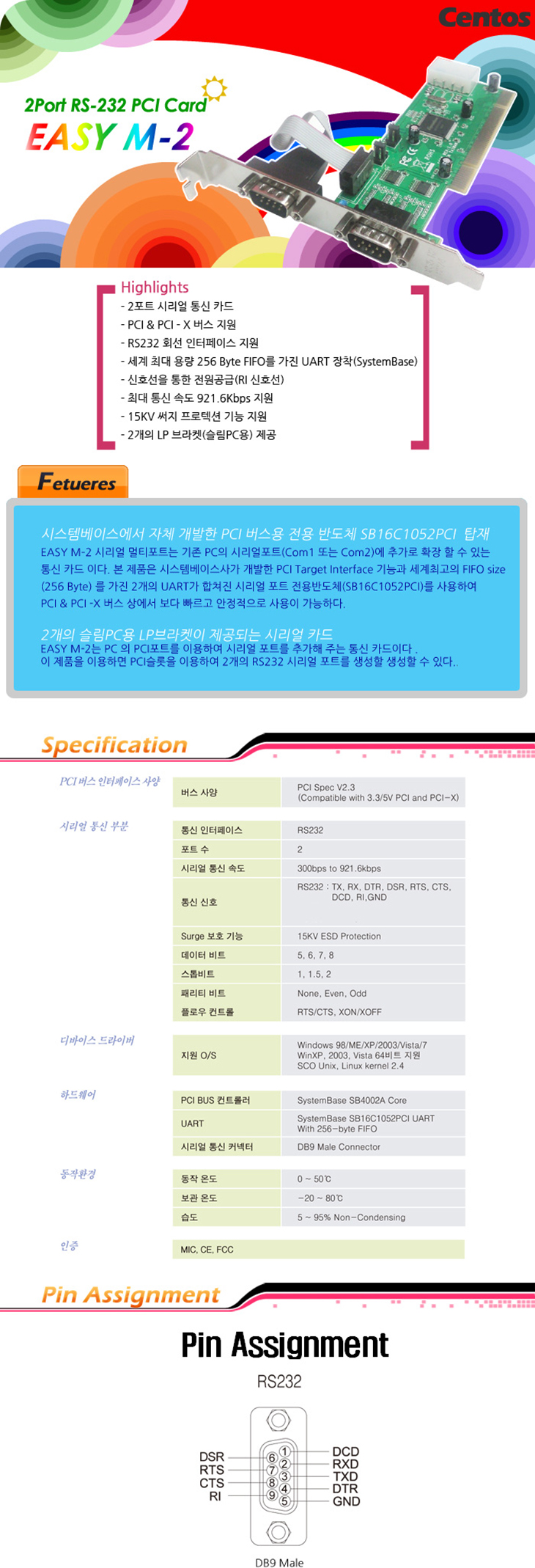 [SL] CENTOS RS-232C 2Port PCI Card(EASY M-2, Slim PCÀåÂø/RI½ÅÈ£¼± Àü¿ø°ø±Þ/Windiws 7Áö¿ø)