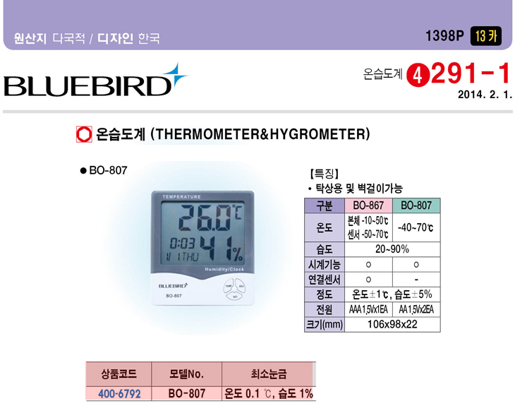 [ºí·ç¹öµå] ¿Â½Àµµ°è(BO-807, -40~70¡É)(Thermometer and Hygrometer)