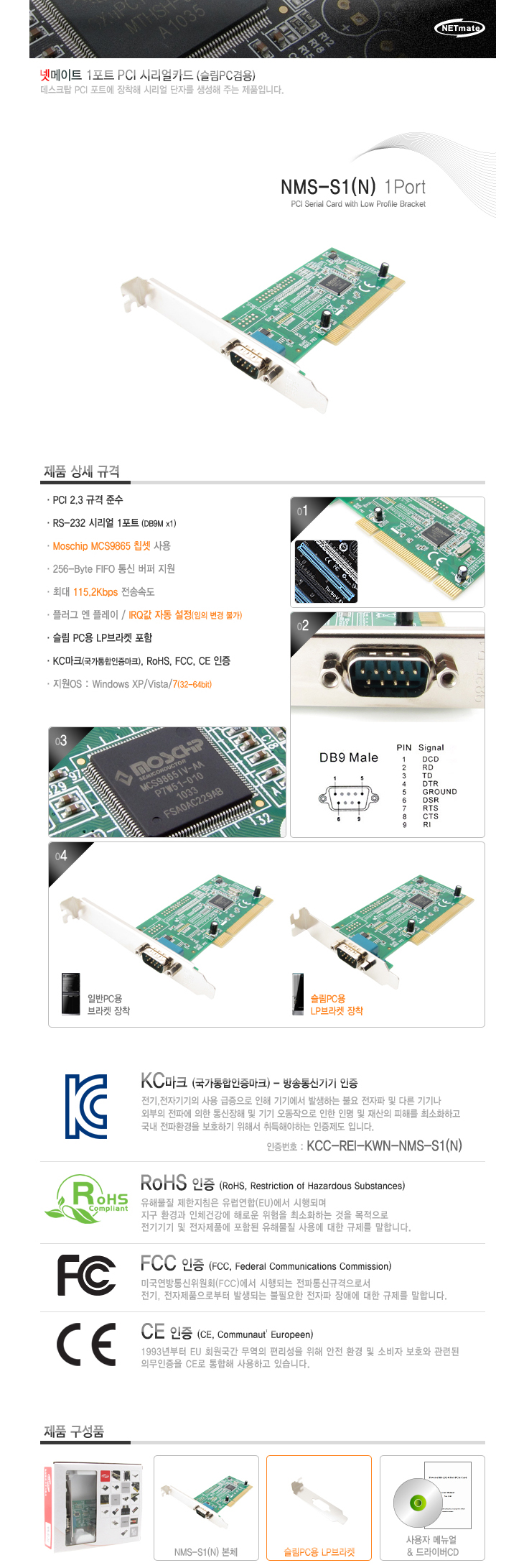 [KW] NETmate RS-232C 1Æ÷Æ® PCI ½Ã¸®¾óÄ«µå(NMS-S1N, DB9Mx1Port, ½½¸²PC°â¿ë, Moschip MCS9865 Ĩ¼Â)