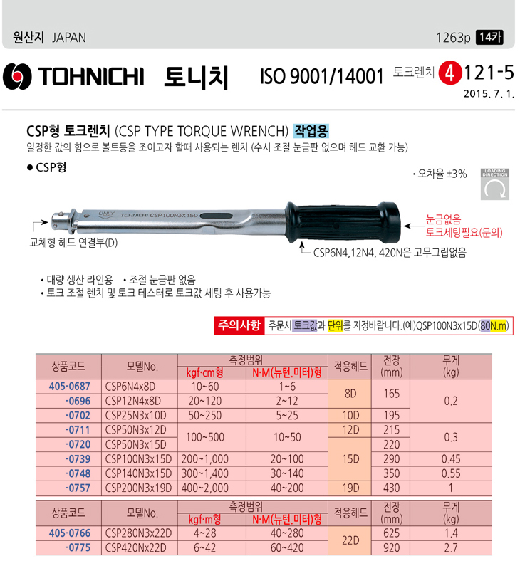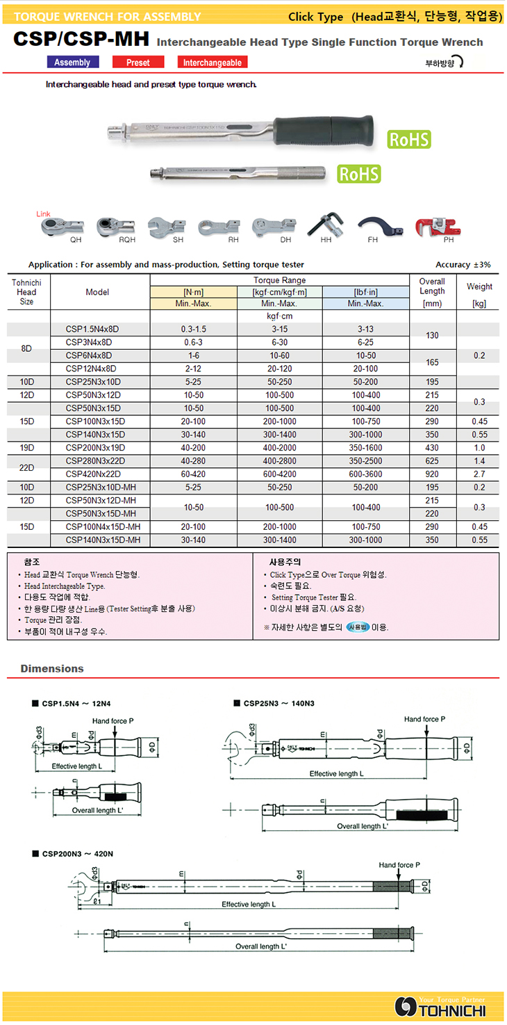 [Åä´ÏÄ¡/TOHNICHI]CSPÇü ÀÛ¾÷¿ë ÅäÅ©·»Ä¡(CSP420Nx22D 6~42kgf.mÇü/60~420nm)(Torque Wrench)