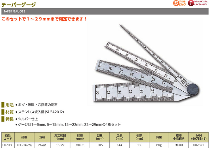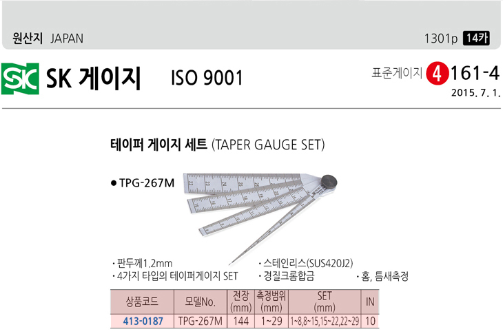 [SK] Å×ÀÌÆÛ°ÔÀÌÁö ¼¼Æ®(TPG-267M, ÀüÀå:144mm, 1~29mm)(Taper Gauge Set)