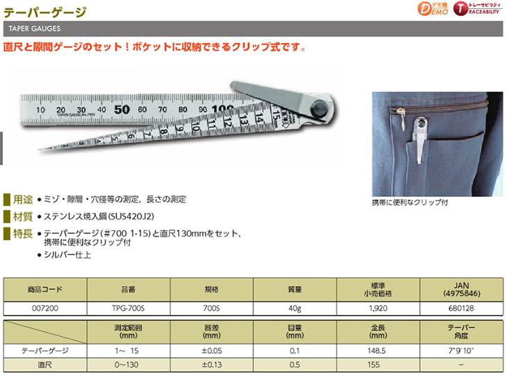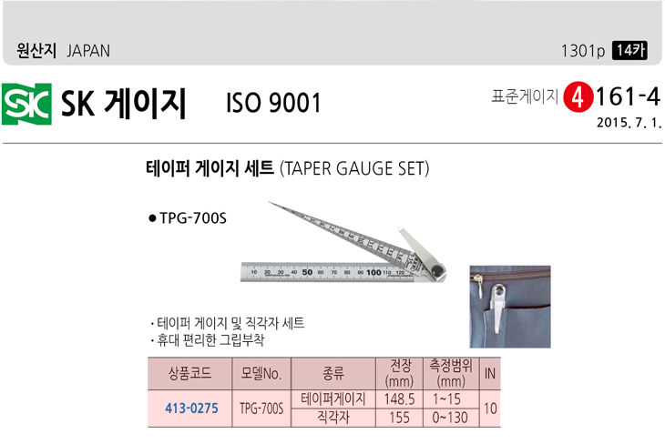 [SK] Å×ÀÌÆÛ°ÔÀÌÁö ¼¼Æ®(TPG-700S, Å×ÀÌÆÛ°ÔÀÌÁö:148.5mm/1~15mm + Á÷°¢ÀÚ:155mm/0~130mm)(Taper Gauge Set)