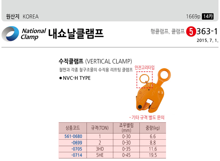 [³»¼î³¯Å¬·¥ÇÁ] ¼öÁ÷Ŭ·¥ÇÁ(NVC-H 3HD 3Ton, ¾ÈÀü°í¸® ŸÀÔ, öÆÇ°ú °¢Á¾ ö±¸Á¶¹°ÀÇ ¼öÁ÷¿ë ¸®ÇÁÆÃ Ŭ·¥ÇÁ)(Vertical Clamp)