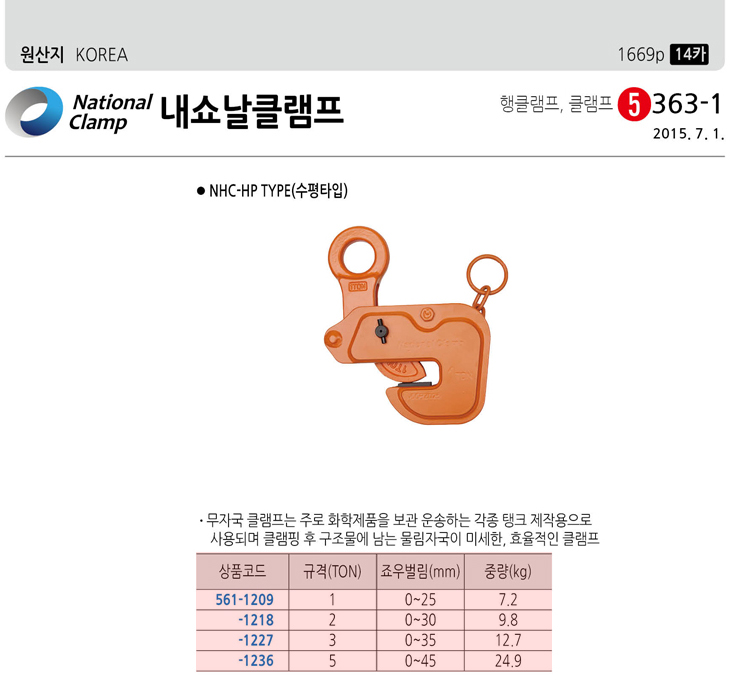 [³»¼î³¯Å¬·¥ÇÁ] ¹«ÀÚ±¹ Ŭ·¥ÇÁ(NHC-HP ¼öÆòŸÀÔ, 1Ton)(Horizontal Clamp)