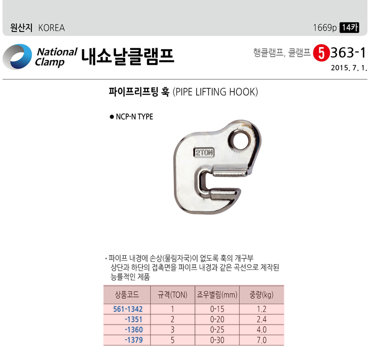 [³»¼î³¯Å¬·¥ÇÁ] ÆÄÀÌÇÁ¸®ÇÁÆÃ Ȥ(NCP-N Type, 2Ton)(Pipe Lifting Hook)