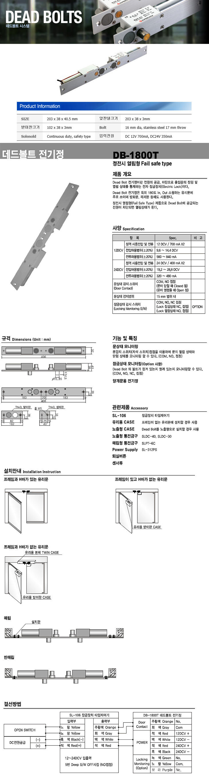 [SU] µ¥µåº¼Æ®(DB-1800T, Á¤Àü½Ã ¿­¸²Çü, DC12/24V, 406x38x40.5mm)(Dead Bolt Fail Safe Type)