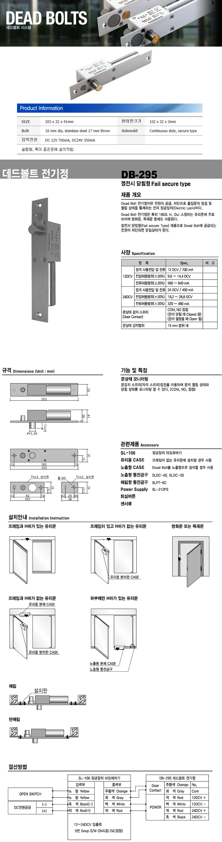 [SU] µ¥µåº¼Æ®(DB-295, Á¤Àü½Ã ´ÝÈûÇü, ½½¸²Çü/ÆøÀÌ Á¼Àº¹®, DC12/24V, 203x32x41mm)(Dead Bolt Fail Secure Type)