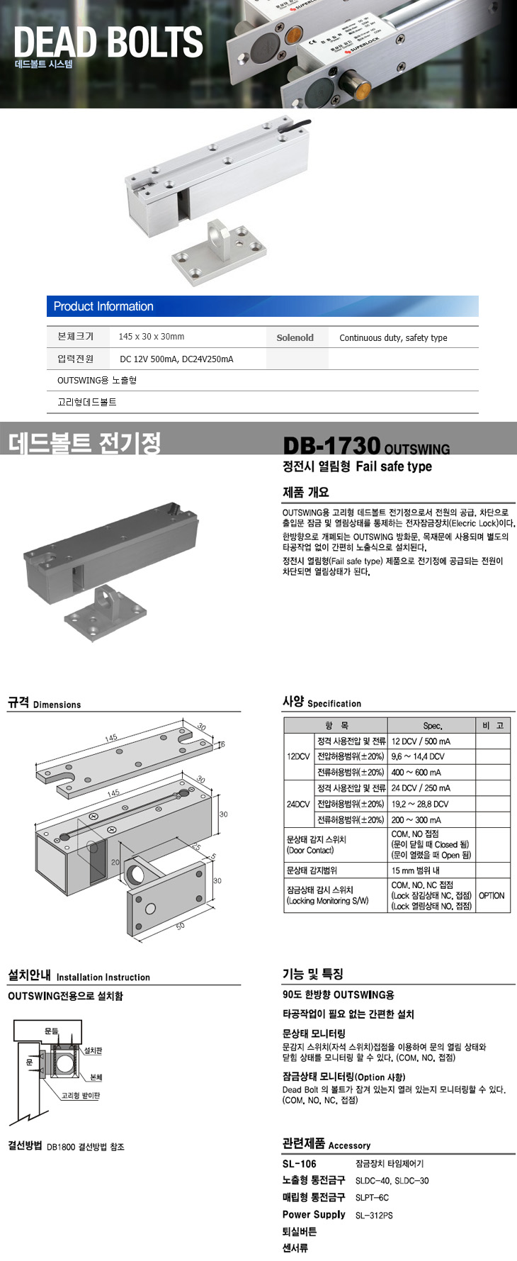[SU] µ¥µåº¼Æ®(DB-1730, Á¤Àü½Ã ¿­¸²Çü, OUTSWING¿ë ³ëÃâÇü/°í¸®Çüµ¥µåº¼Æ®, DC12/24V, 145x30x30mm)(Dead Bolt Fail Safe Type)