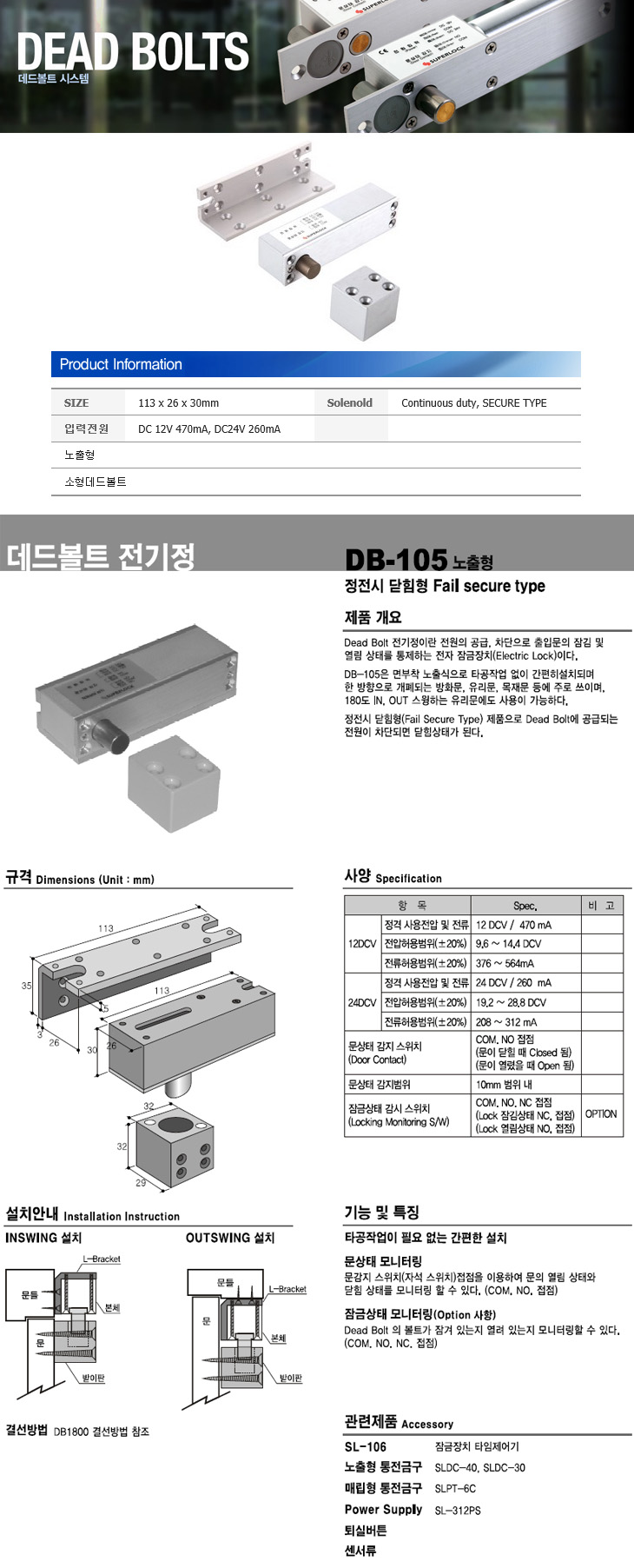 [SU] µ¥µåº¼Æ®(DB-105, Á¤Àü½Ã ´ÝÈûÇü, ³ëÃâÇü/¼ÒÇüµ¥µåº¼Æ®, DC12/24V, 113x26x30mm)(Dead Bolt Fail Secure Type)