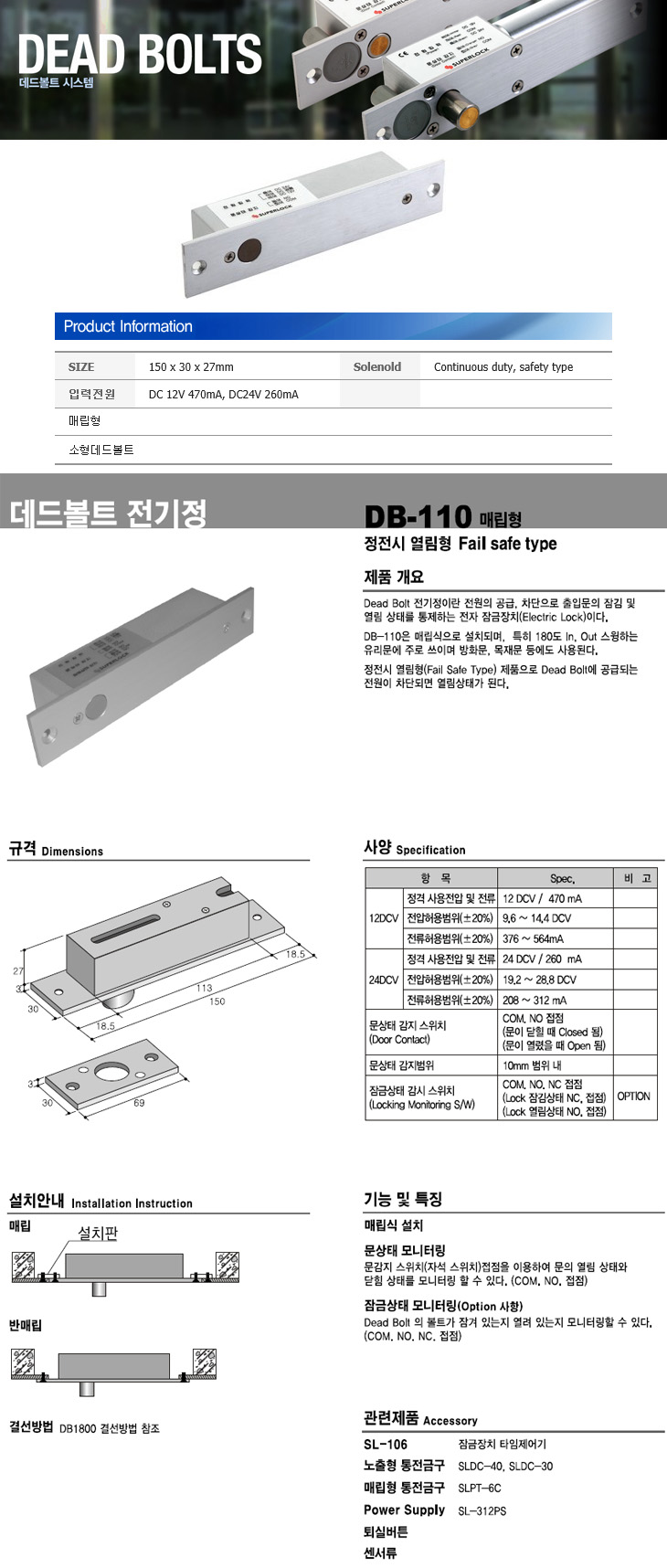 [SU] µ¥µåº¼Æ®(DB-110, Á¤Àü½Ã ¿­¸²Çü, ¸Å¸³Çü/¼ÒÇüµ¥µåº¼Æ®, DC12/24V, 150x30x27mm)(Dead Bolt Fail Safe Type)