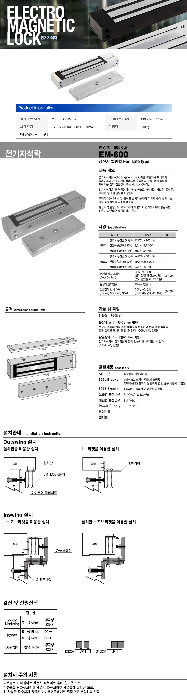 [SU] Àü±âÀÚ¼®¶ô/ÀÌ¿¥¶ô(EM-600, 280x59x35mm, DC12V/24V, 600Kg, EM-Lock)(Electro Magnetic Lock)