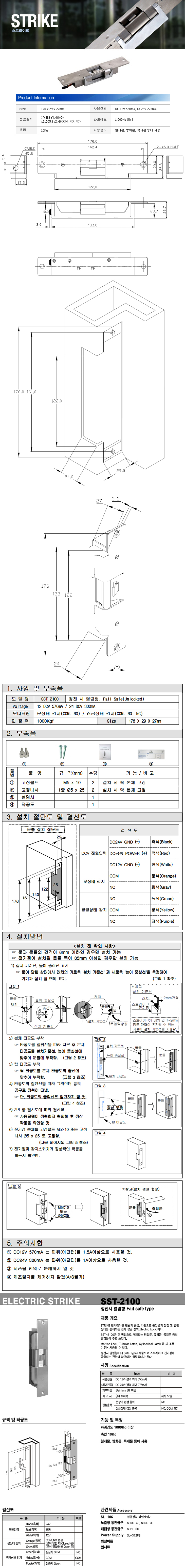 [SU] ½ºÆ®¶óÀÌÅ©¶ô(SST-2100, Á¤Àü½Ã¿­¸²Çü, DC12/24V, öÀç¹®/¹æÈ­¹®/¸ñÀç¹®, 176x29x27mm)(Strike Lock)